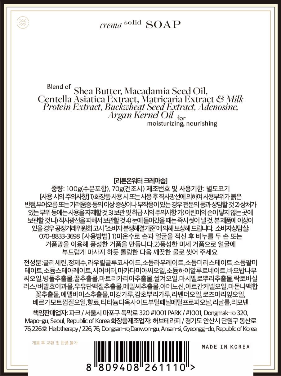 우윳빛깔을 가진 리튼온워터의 크레마솝은 실제 우유 단백질이 들어가 있는 아이입니다. 우유 단백질과 함께 쌀겨,메밀, 백합 그리고 에델바이스와 같은 자연의 원료에서 오묘한 조합을 찾고자 했고 그렇게 탄생한 크레마솝은 보기에도 아름다운 상아빛을 띄고 있습니다. 적당한 미온수로 젖은 피부로 비누를 만지면 풍성한 거품이 생기면서 부담스럽거나 인위적이지않은, 어쩌면 조금 달달한 우유와같은 부드러운 향이 조용히 다가옵니다. 그리고 씼고 나서 피부가 당기지 않고, 오히려 보습효과에 의해 보드라워지는게 씼는다- 라는 행위를 더 즐겁게 만들어주지 않았나 생각합니다.
